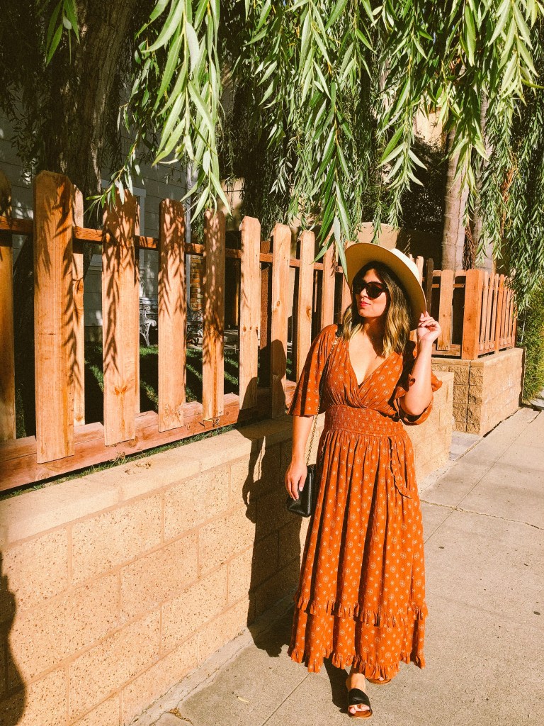 So here I am, slowly welcoming fall by incorporating pieces into my wardrobe that are still lightweight to accommodate the heat, but scream autumnal vibes. This particular look David and I call “Hocus Pocus,” as it gives off a witchy vibe. This airy dress is ideal for running amuck during the September/October heatwave, and the burnt orange color evokes the feelings of warmth and comfort- something I think we all associate with fall. To top it all off (no pun intended), I added my new favorite hat, which is quickly becoming a staple in my repertoire.
