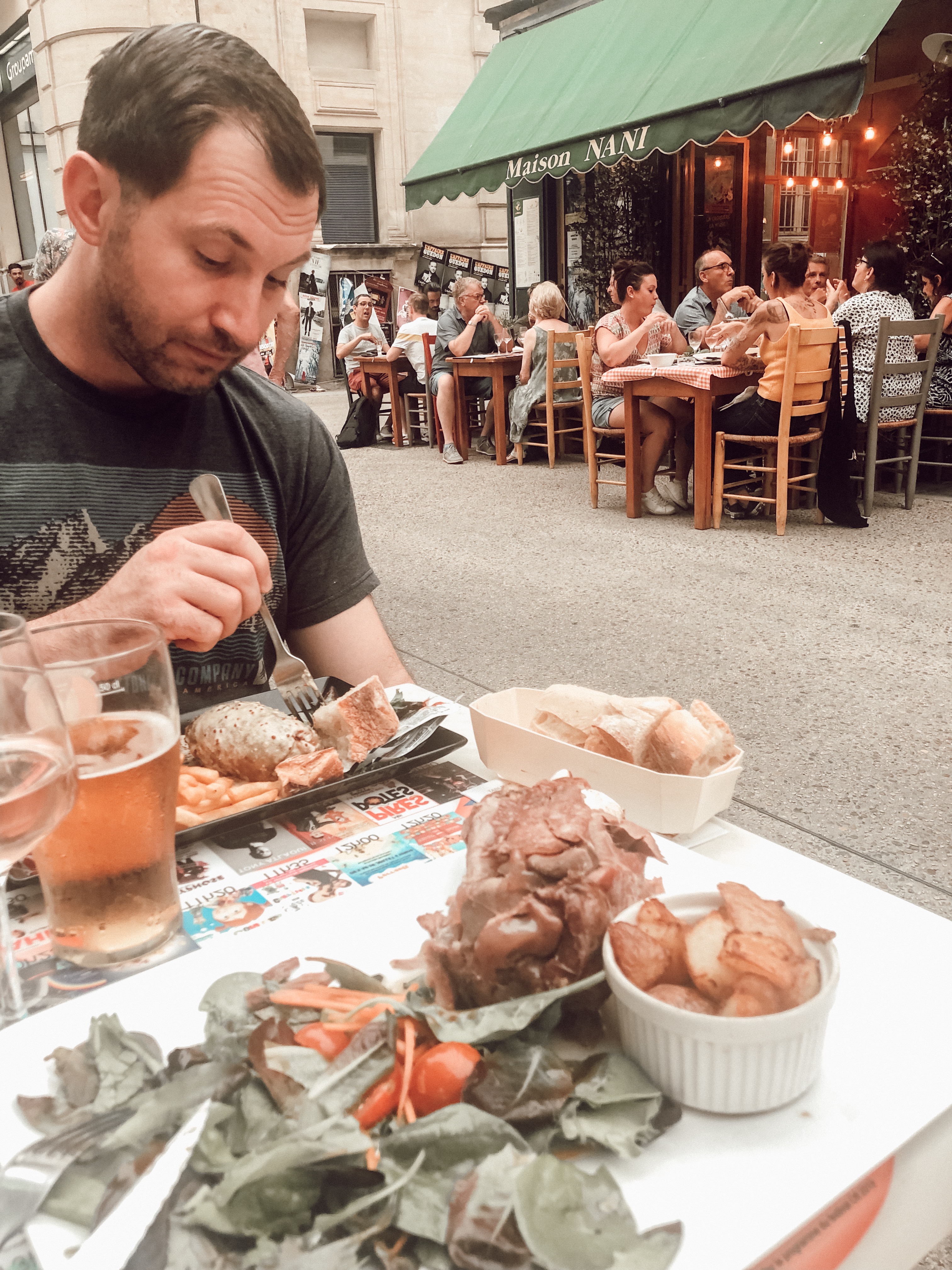 Besides checking out the historical sites, we also made sure to indulge our other senses with eating and drinking. For dinner, we enjoyed a lovely meal consisting of a pork leg and white sausage. Let’s not forget a glass of rosé, which this was the first of many had on this trip. Dining outside is so different here and is such a treat; There’s something so French about it that I love.